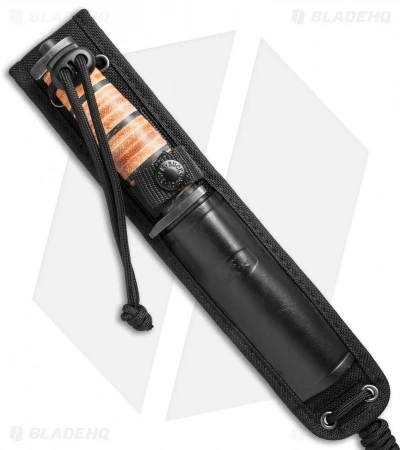 - Includes a leather/nylon sheath with webbing for MOLLE compatible gear