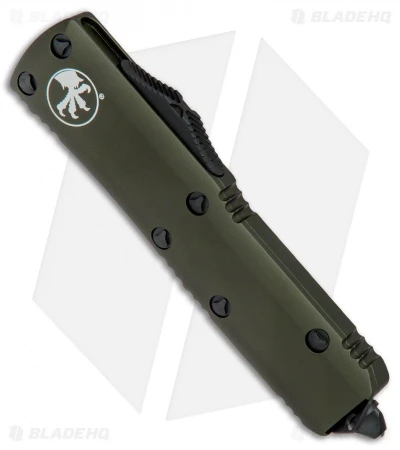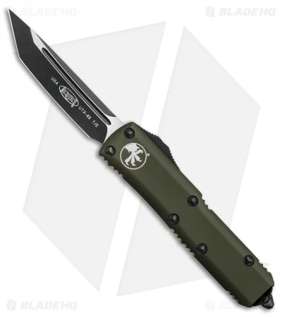 This UTX-85 model has a black finished tanto blade with a plain edge. The 6061-T6 aluminum handle is OD green anodized and outfitted with black hardware, pocket clip, and glass breaker tip.